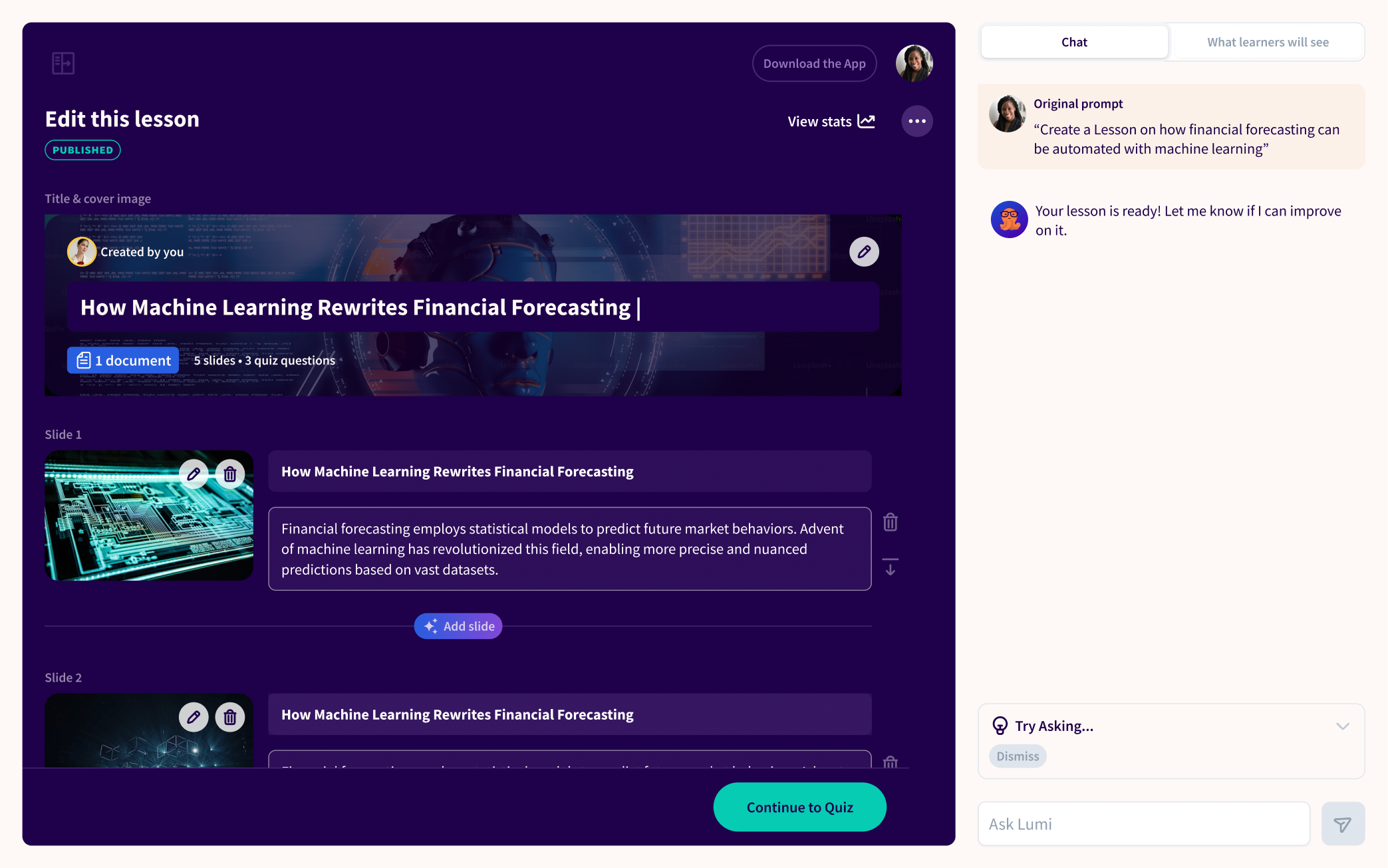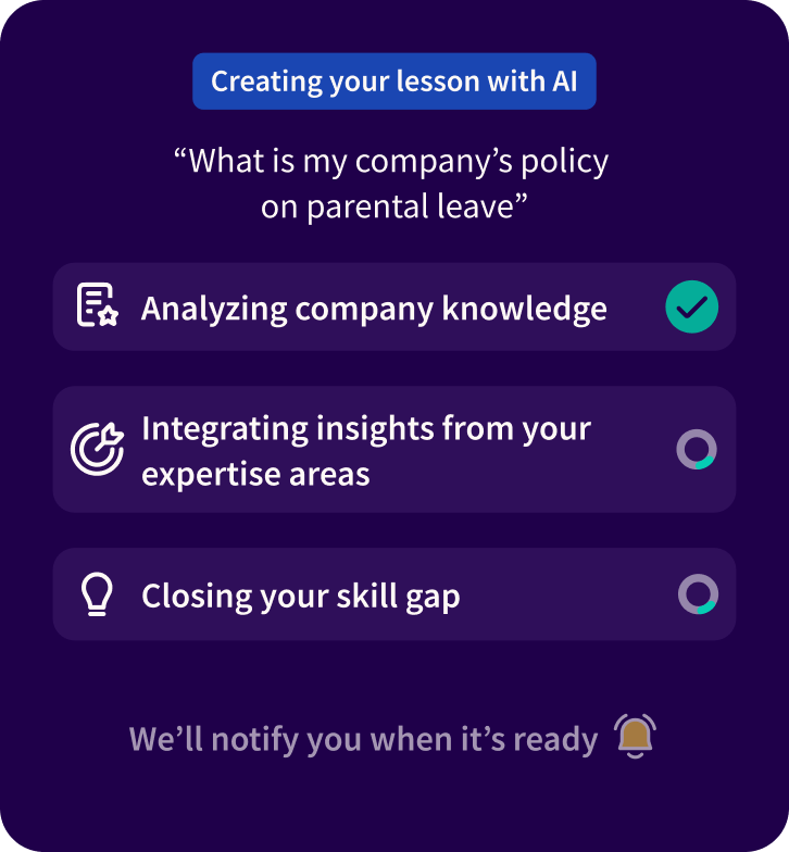 AI generates micro-lessons learners can finish in minutes. When they're done, follow-up questions deepen understanding and personalized next steps keep the momentum going.